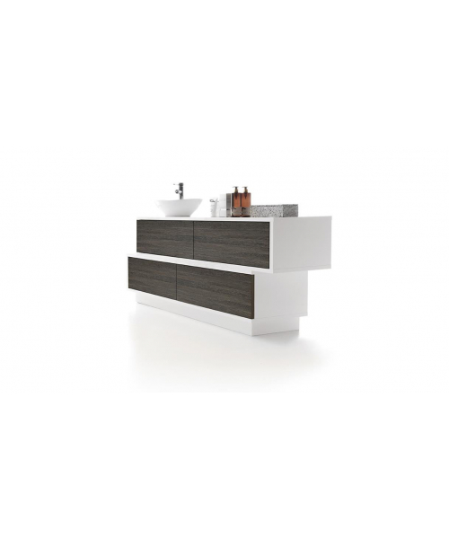 Это сочетание строгих форм и простых линий. Данный предмет мебели может применяться для различных нужд. Корпус выполнен из меламиновых панелей белого цвета. Модель комплектуется четырьмя выдвижными ящиками. Доступно несколько вариантов отделки ящиков – натуральный венге, белая лиственница, дуб бардолино. Ящики могут располагаться друг над другом, или же быть смещенными в одну из сторон. Также в комплектацию входит небольшой умывальник с рычажным смесителем. Умывальник выполнен из износоустойчивого и простого в уходе материала белого цвета. Смеситель выполнен из хромированной стали.