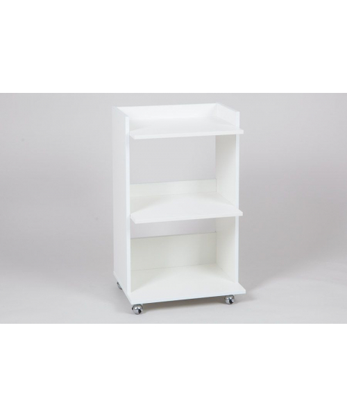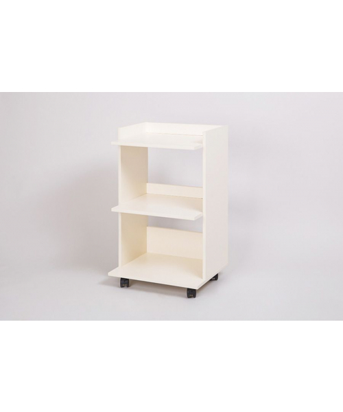 Столик косметолога три полки на колесах. Удобный косметологический столик-тележка с тремя полкапи, ограниченными бортиками с трех сторон. Расстояние между полками 33 см. позволяет ставить высокие флаконы с косметологическими средствами. Влагостойкое ламинированное ДСП порзволяет протирать и обрабатывать столик дез средствами.