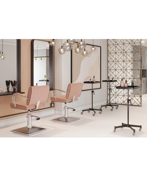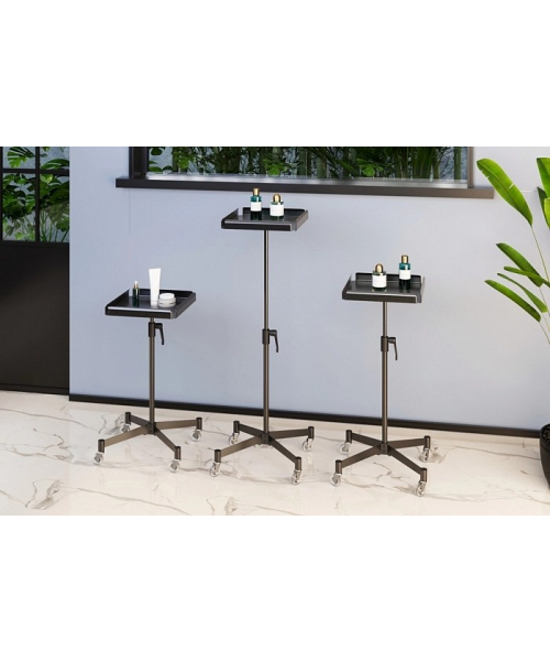 КитайАссистент колориста NA0057-оснащен надежными прорезиненными колесиками, обеспечивающими бесшумное и быстрое перемещение. Столик выполнен из пластика, ножка и основание – из хромированной стали. Предусмотрены отверстия для инструментов, углубления для чаши и ролик для фольги. В комплекте две кисточки, две чаши и шейкер.