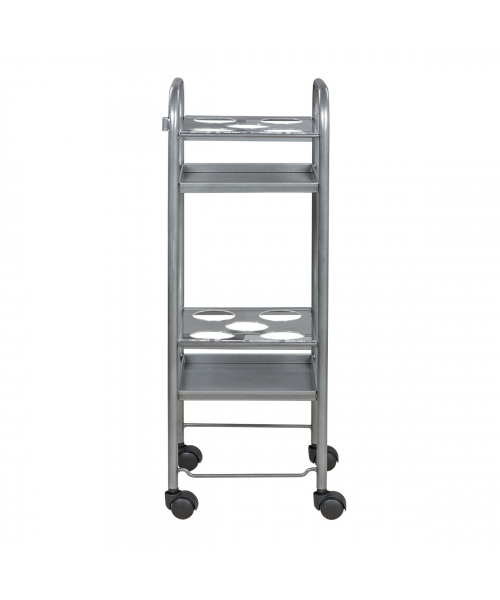 Парикмахерская тележка включает 2 полки, на которых предусмотрено по 5 отверстий для высоких флаконов. Верхние панели над полками съемные, поэтому данную модель можно использовать как обычную тележку. В конструкции нет боковых стенок, благодаря чему можно воспользоваться необходимыми средствами с любой стороны. Наличие вращающихся колес позволяет легко и плавно перемещать парикмахерское оборудование по рабочей зоне. Передвигая тележку, можно не переживать за напольное покрытие, так как колесики из пластика не повредят его.